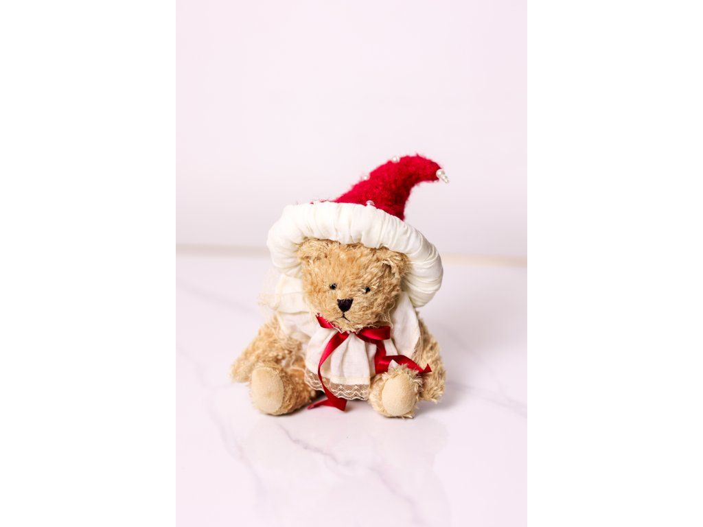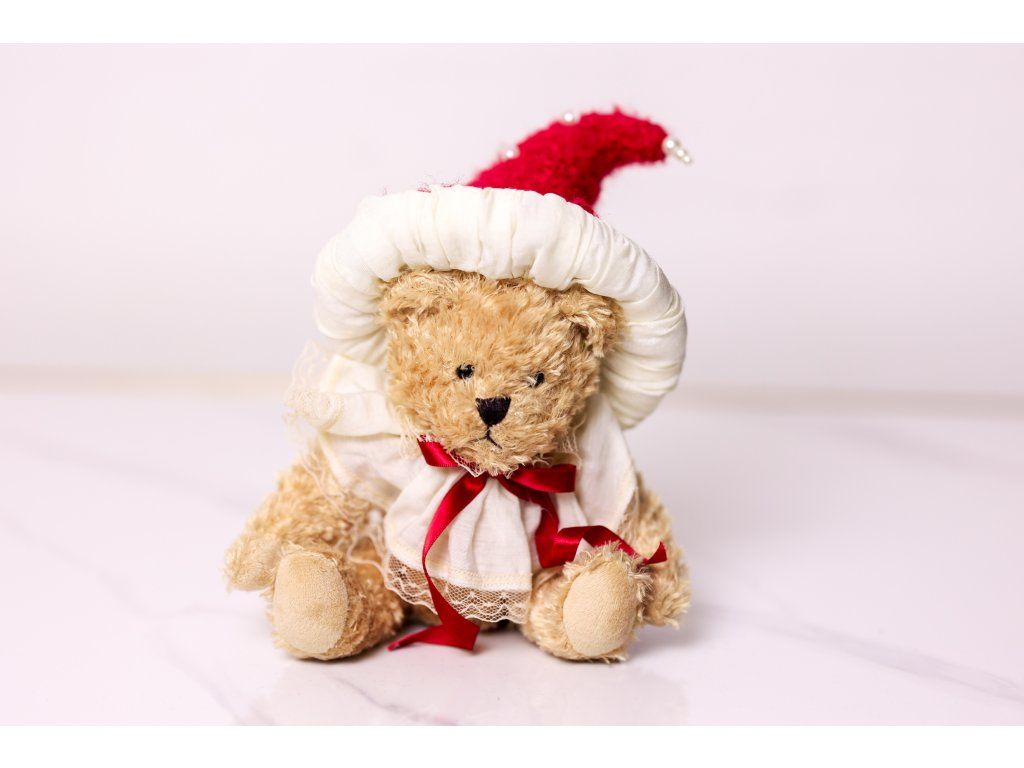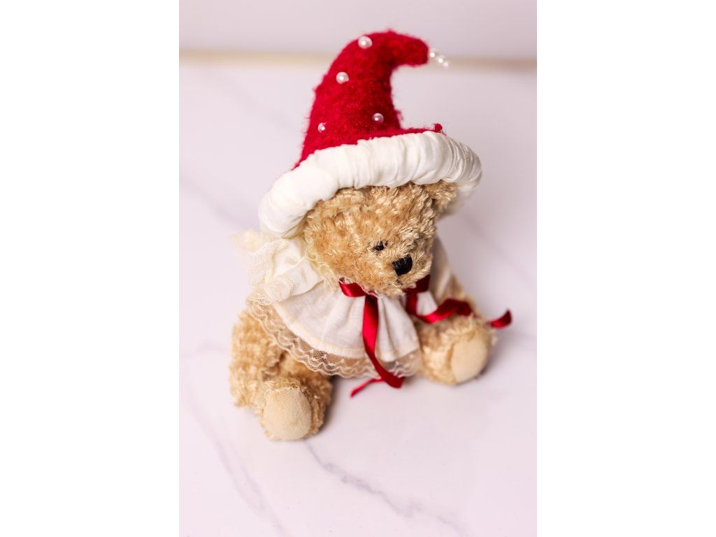 Plyšový medvídek v červeném kloboučku připomínající lesní mochomůrku.