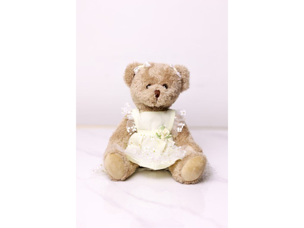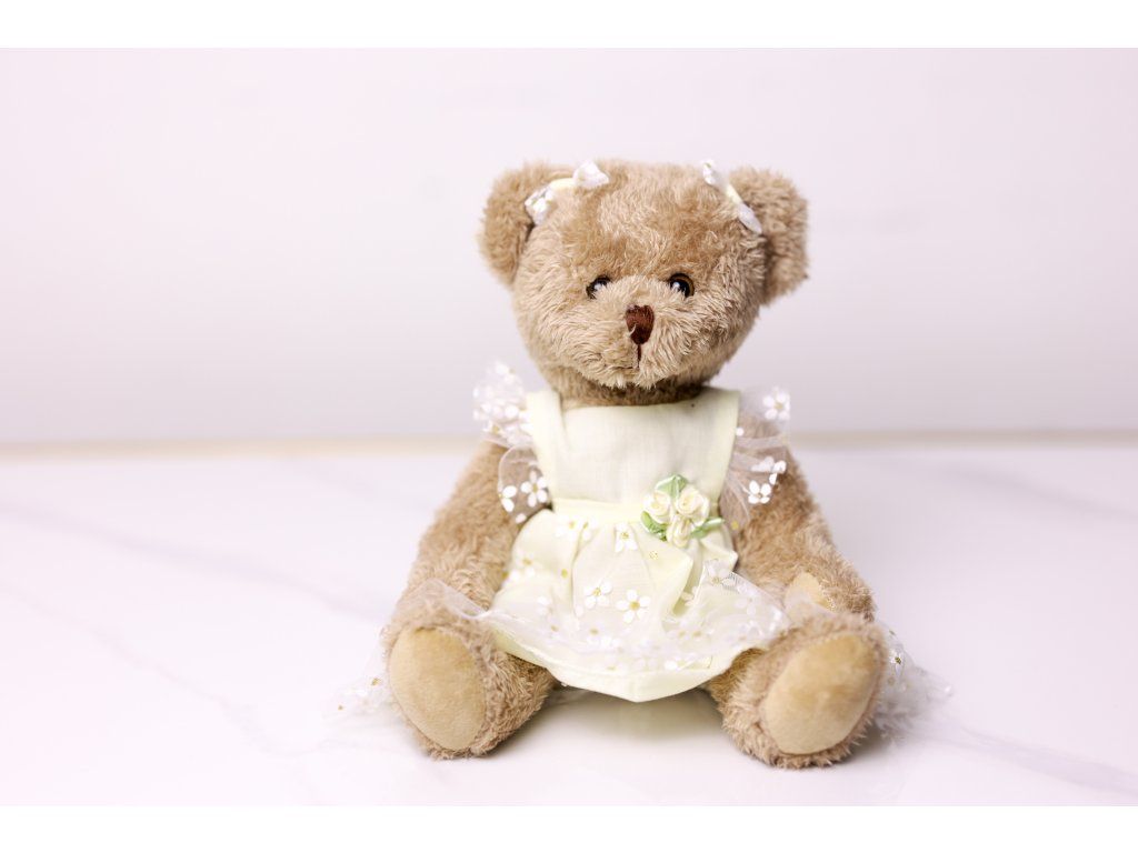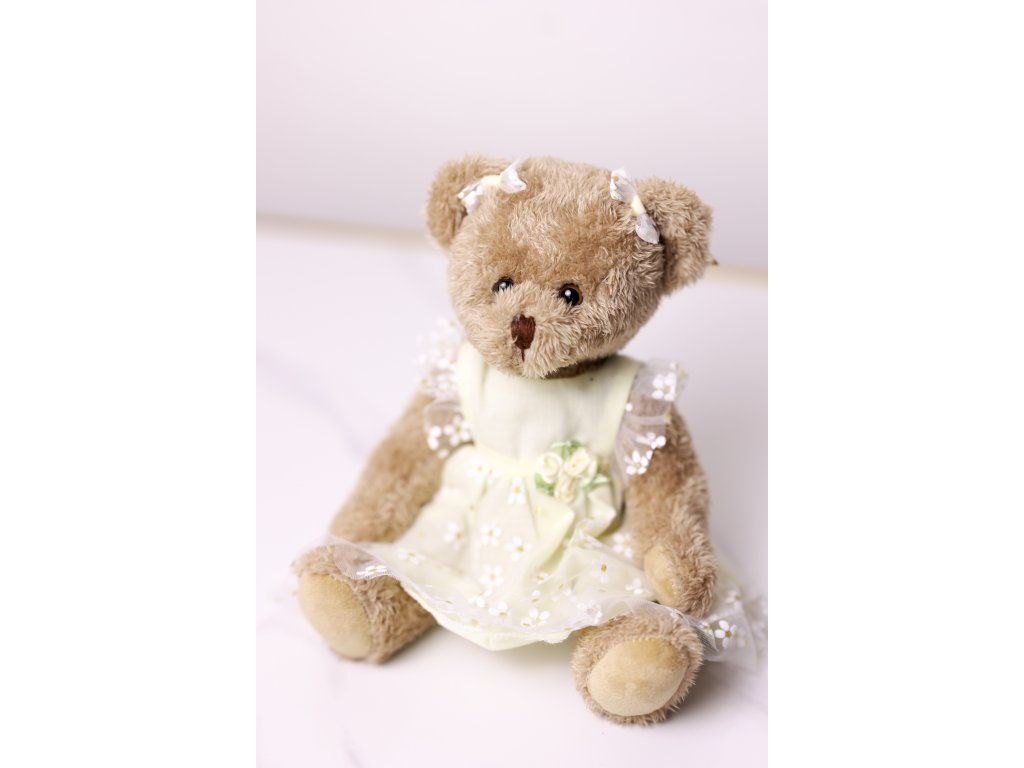 Plyšový medvídek v kytičkovaných šatech, volánové rukávy, 2 mašle na uších.