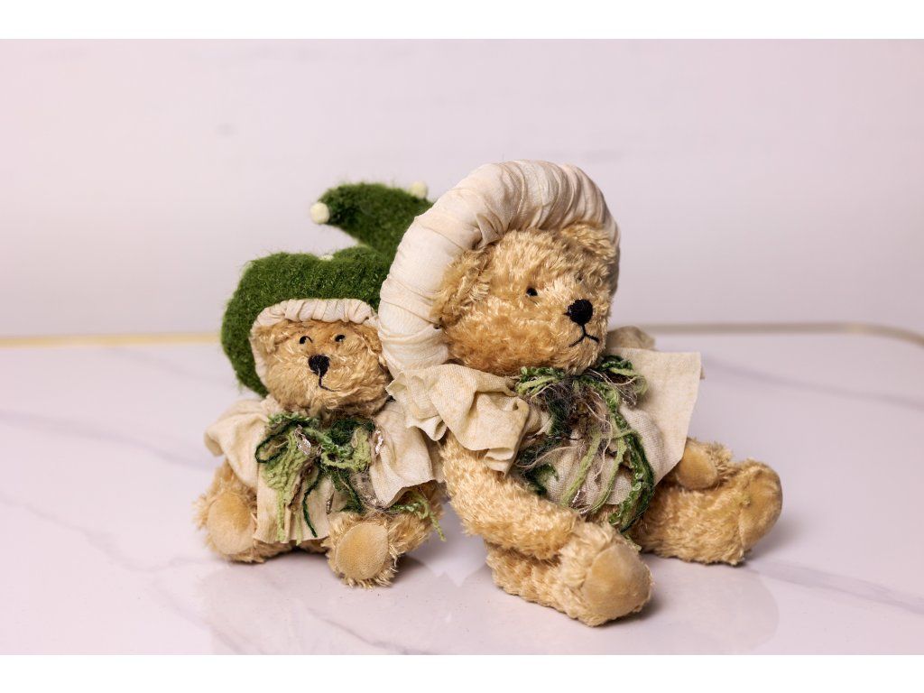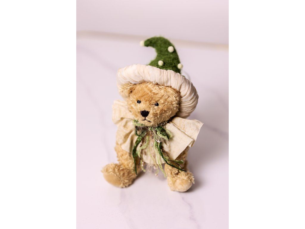 Plyšový medvídek v zeleném kloboučku připomínající lesní mochomůrku.
